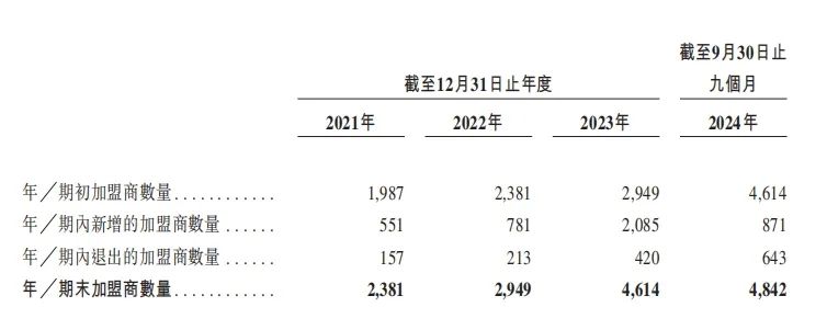 不僅如此,蜜雪冰城賣的奶茶杯數合計售出71億杯飲品,加盟商也在不斷增長。根據蜜雪冰城招股書顯示,2021年度、2022年度、2023年度及2024年前九個月,公司加盟商數量分別為9784名、13625名、16784名及19780名。