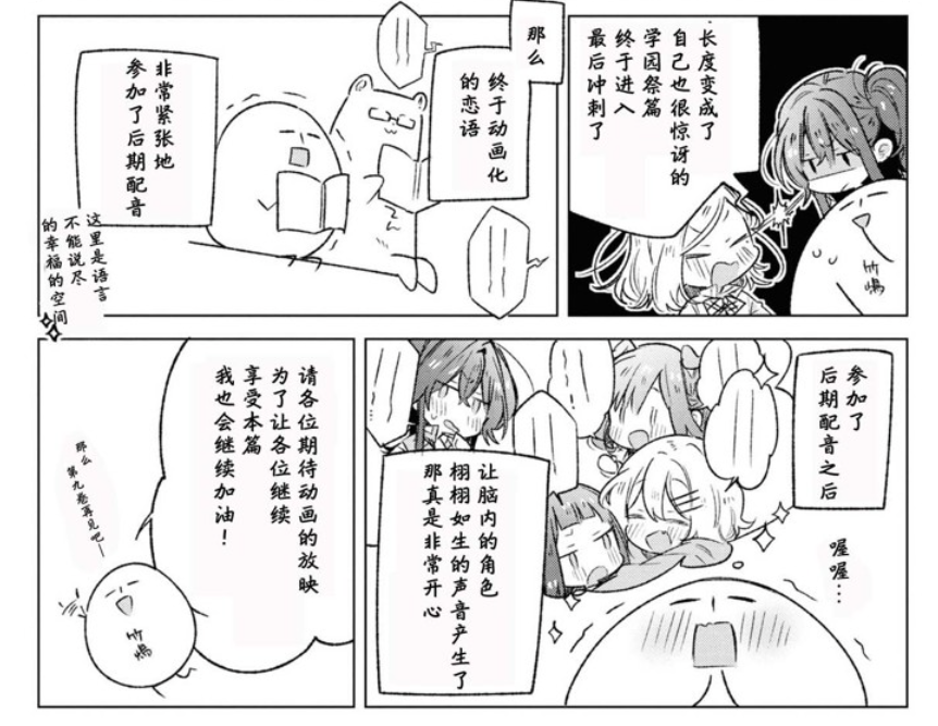 半年之後的漫畫第8卷單行本里,竹嶋向讀者們傳達了親自參加了後期配音工作的消息。如果不出意外的話,《戀語輕唱》的粉絲們理應在不久後等來心心念唸的動畫。