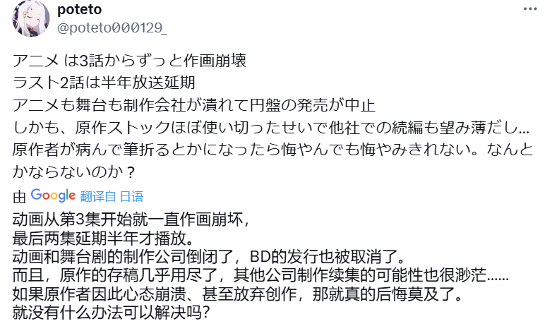 頻頻崩壞的低質量作畫,加上接連拖垮兩家制作公司的傳奇經歷,以《戀語輕唱》現如今的窘境來看,這部動畫或許有望成為“有史以來待遇最慘的漫改動畫”的有力競爭者。
