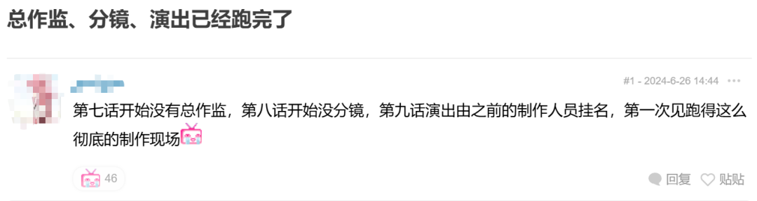 沒人能確保這位網友提供的信息是否真實可信,但我們還是能通過動畫傳遞出的信息一窺製作現場的混亂,比如有網友在觀察本作的表記時發現,總作監、分鏡、演出等職位均在不同集數出現了缺席情況,照這麼看似乎也對應得上之前爆料的那些行業內幕。