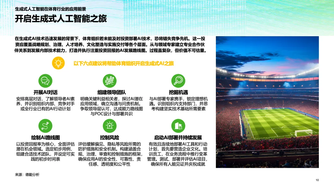 王易認為,開展AI對話、組建領導團隊、挖掘機遇、繪製AI路線圖、控制風險、以及啓動AI部署並持續發展將是體育組織開啓生成式人工智能之旅的六個關鍵點,或者説六個關鍵的建議。