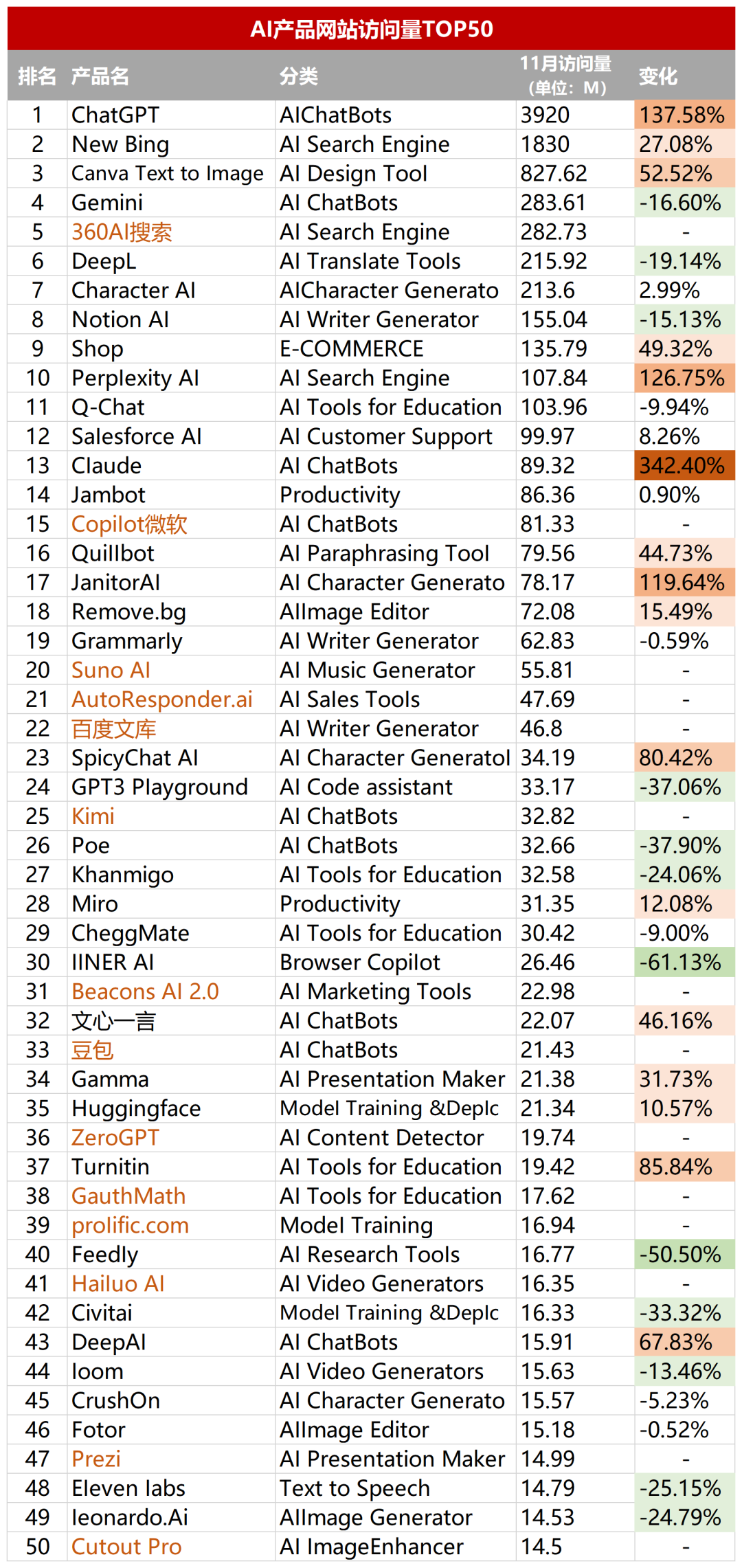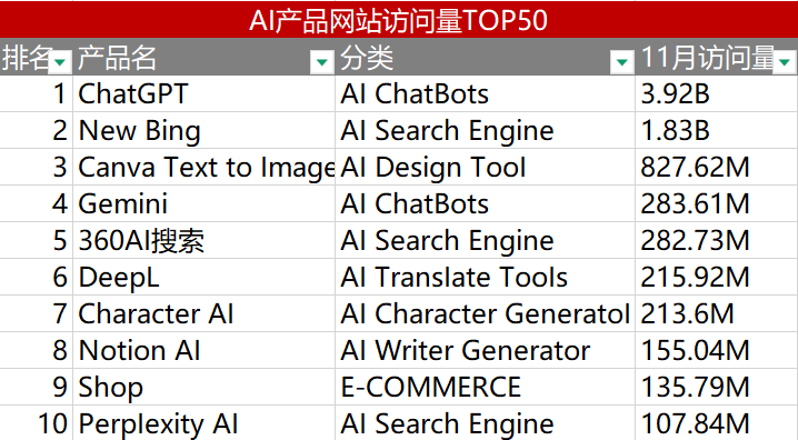 除去ChatGPT的份額,剩餘49款產品中,11月較1月訪問量增長便只剩下27%。