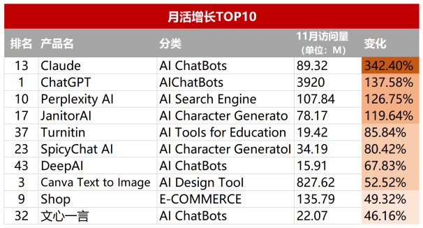 從1月到11月,在流量增長最快的前10個產品裏,有4個產品的訪問量增長了一倍,分別是ChatGPT、Perplexity、AI伴侶產品Janitor AI以及Claude。