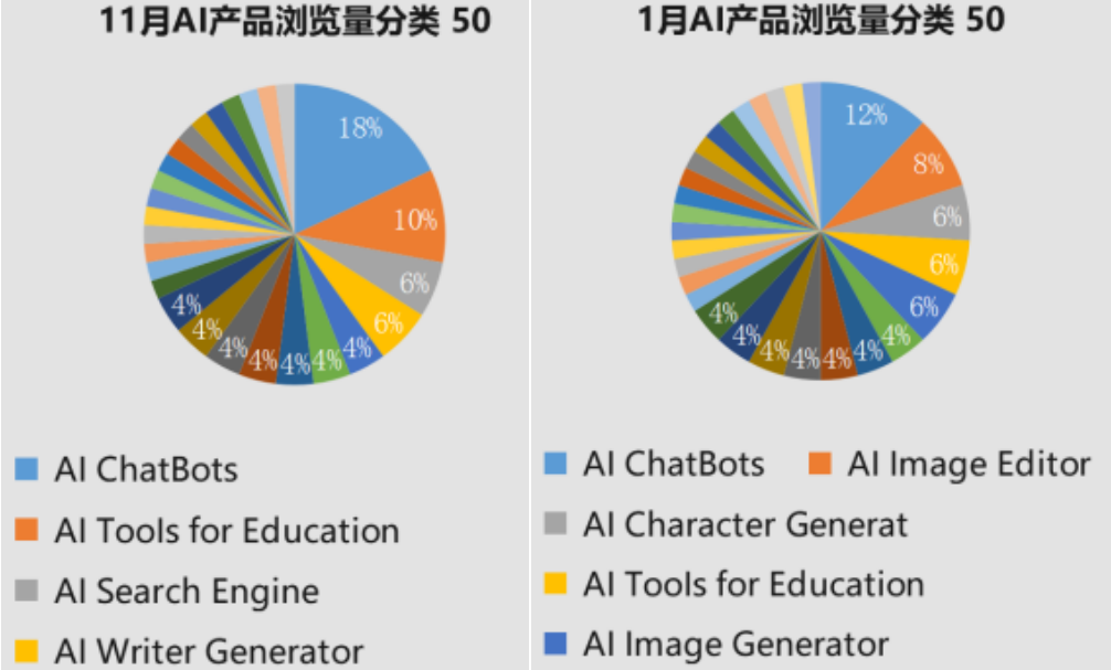 3)AI ChatBots依然是最核心的AI應用,重要性還在不斷提升。對比去年1月和11月Top50,AI ChatBots入圍的數量有所上升,從7個增長到9個。