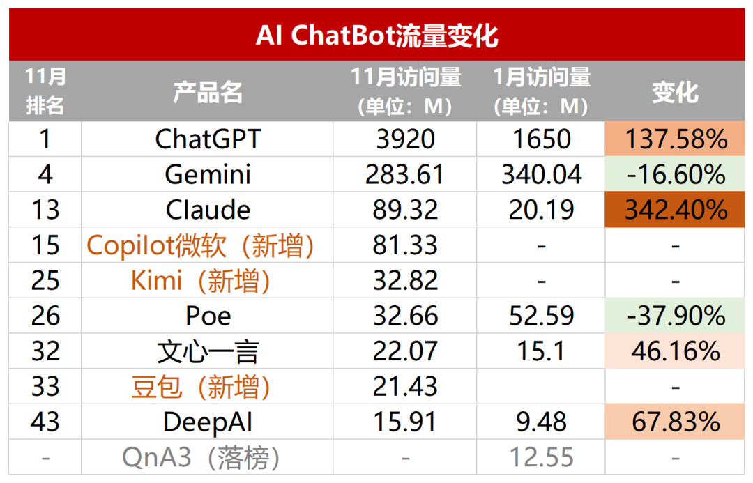儘管在很多人看來,AI應用的爆發速度低於預期,但當我們觀察1-11月AI應用的流量變化,仍然發現了一些有意思的變化: