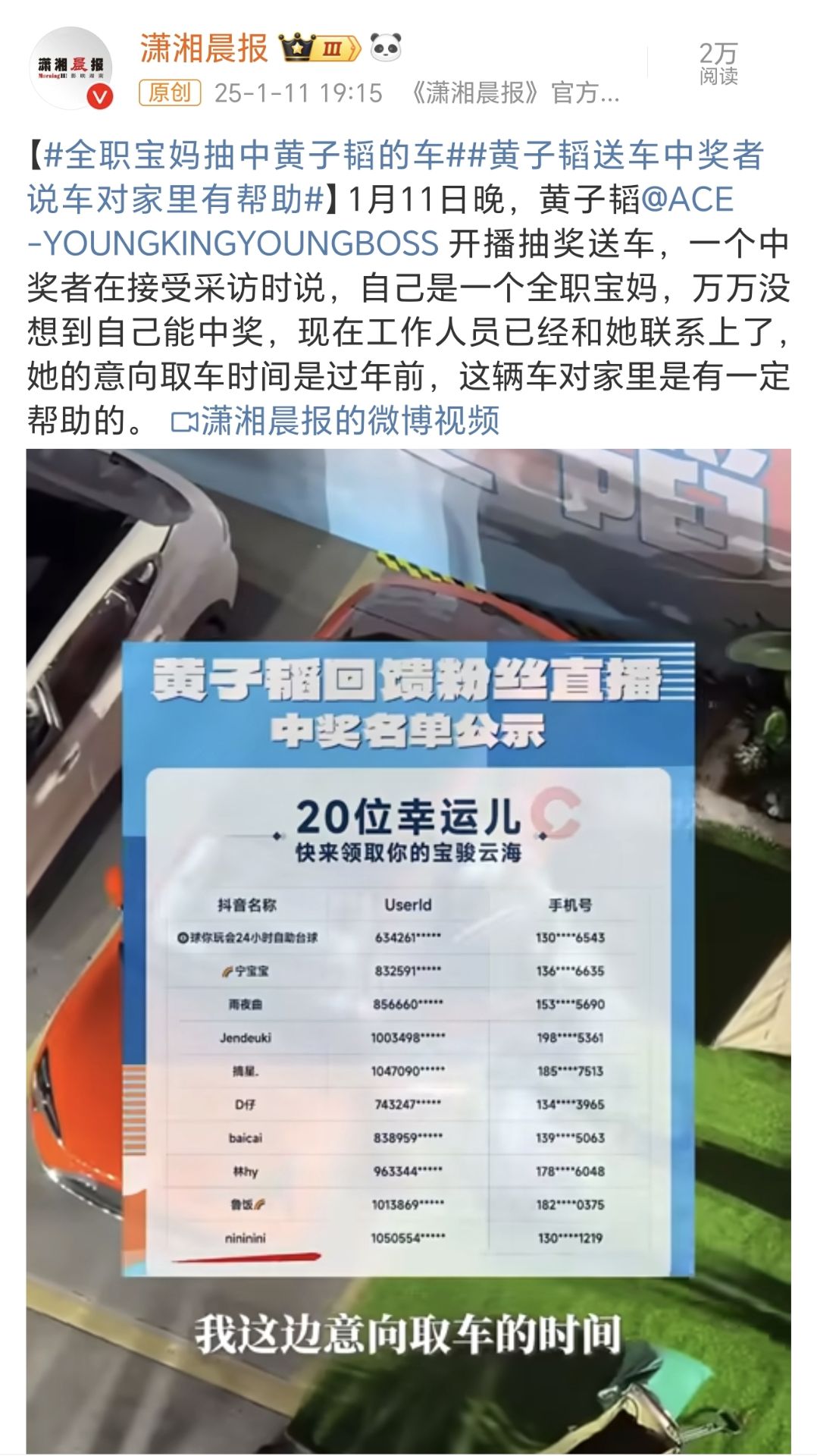 據瀟湘晨報相關消息,最近,黃子韜發視頻表示將在2025年1月10日晚直播送車,總數不低於10台。有網友偶遇其送車現場,其本人在車上試駕。