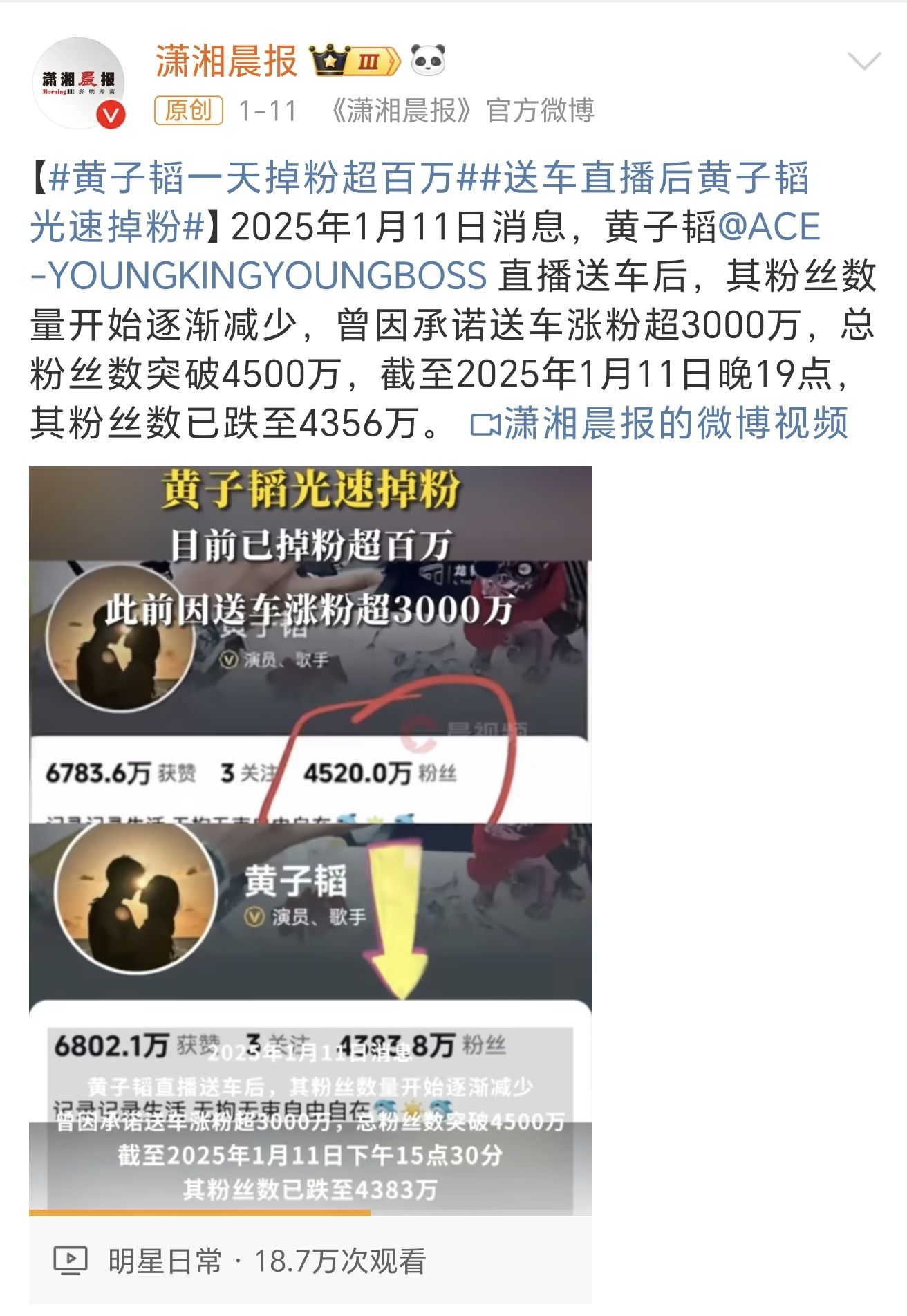 而在直播送車後,黃子韜的粉絲數量開始逐漸減少,原先粉絲數因承諾送車超了3000萬,總粉絲數突破4500萬,但截至2025年1月11日晚19點,黃子韜的粉絲數量已經跌至4356萬。