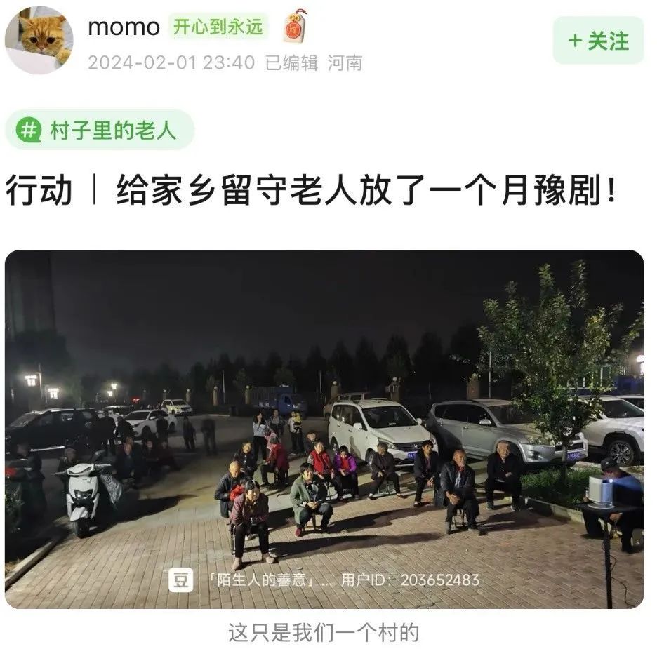 有人給村裏的留守老人放了一個月的豫劇,大家都看得津津有味。