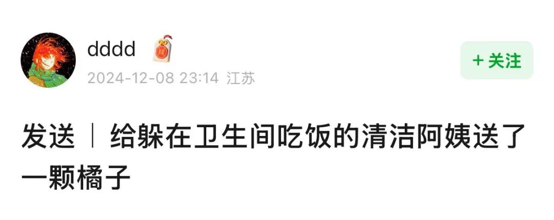 還有人在逛商場的時候給躲在衞生間裏吃飯的保潔阿姨送了一顆橘子。