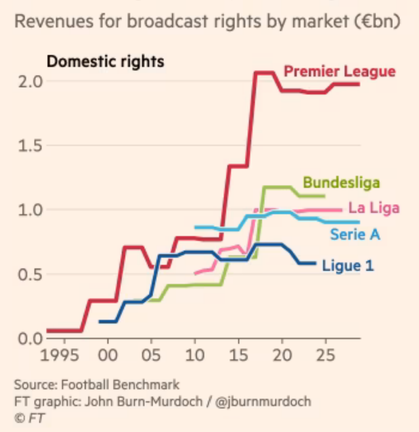 邏輯順理成章:正是通過那塊或大或小的屏幕,足球才得以超越場地的侷限,把每場比賽的受眾提升好幾個數量級。觸達最多消費者的渠道,自然也應該貢獻最多的收入來源。