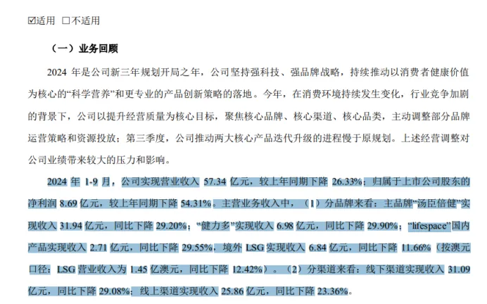 三季報顯示,2024年1-9月份,湯臣倍健的主營業務收入中,主品牌“湯臣倍健”實現收入 31.94 億元,同比下降 29.20%;“健力多”實現收入 6.98 億元,同比下降 29.90%;“lifespace”國內產品實現收入 2.71 億元,同比下降 29.55%,境外 LSG 實現收入 6.84 億元,同比下降 11.66%(按澳元口徑:LSG 營業收入為 1.45 億澳元,同比下降 12.42%)。