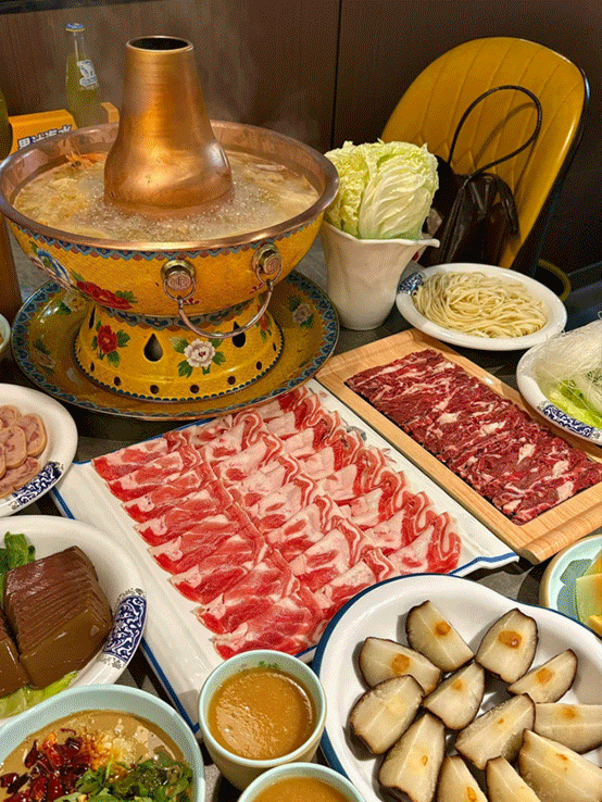 在西北,無論是什麼場合,羊肉和麪食總是必不可少的,火鍋自然也是如此。二者在擺盤上相得益彰,粉嫩新鮮的羊肉與各類澄黃如金、麥香四溢的麪食相互映襯,誘人至極。