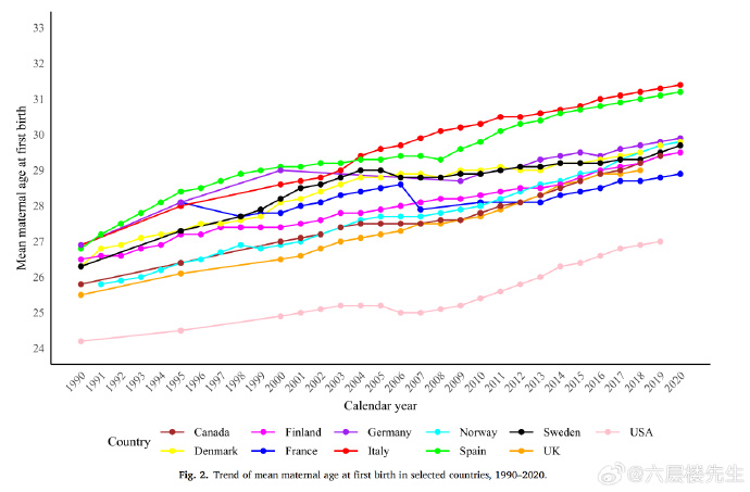 在這個階段,我們看到了更多國外的數據,比如一篇文獻詳細記錄了一些國家從1990~2020年近30年生育年齡的變化,圖1是初次生育的平均年齡,圖2整體生育的平均年齡,從趨勢來看,整體都傾向於推遲生育年齡,大致是從過去的28歲,到了現在的30~32歲。