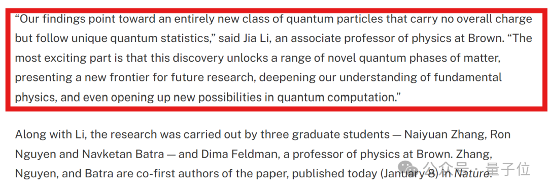 換句話説,這種新粒子的電荷不是常見的整數形式(如電子帶一個單位的負電荷),同時其量子行為不遵循傳統的玻色子或費米子統計規律。