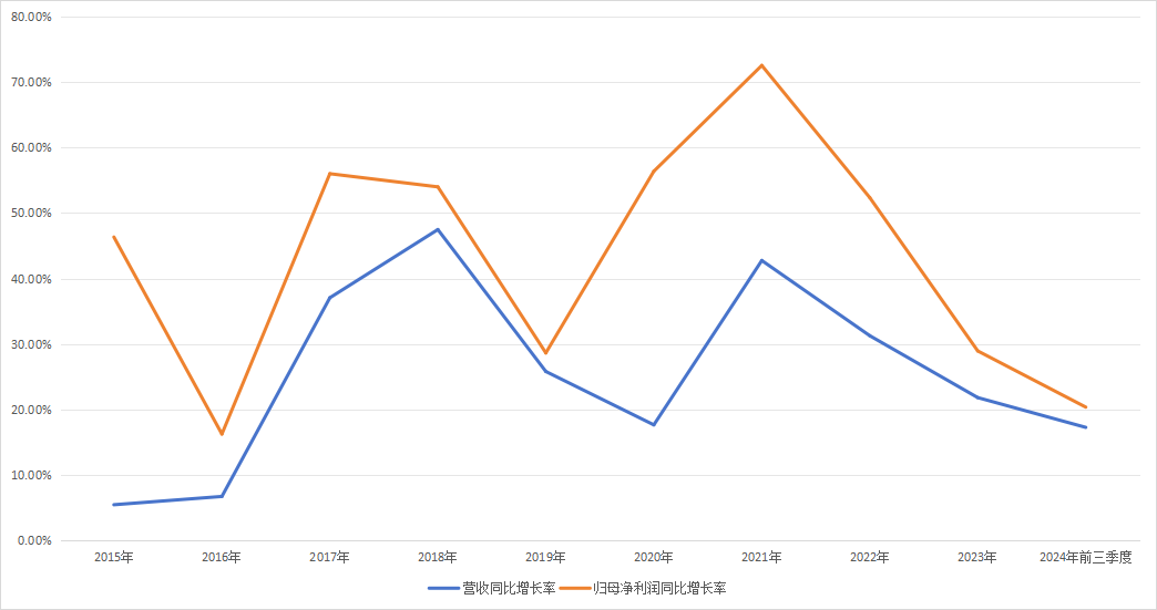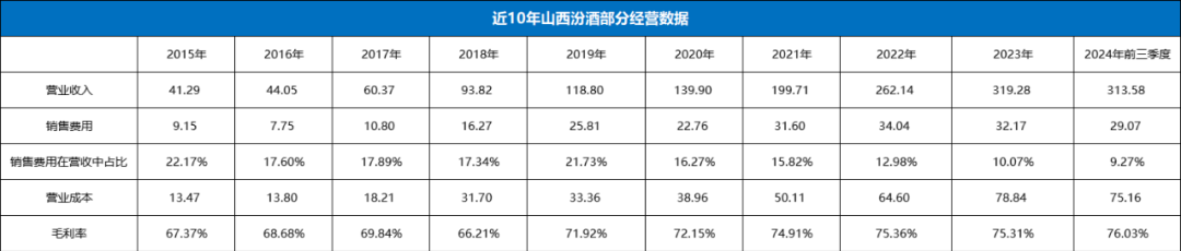 事實也正是如此,在2019年-2021年間,山西汾酒歸母淨利潤的增速遠高於營收,但在2022年之後開始放緩,2024年三季度二者增速幾乎持平。