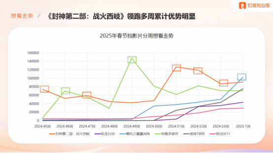 根據燈塔專業版即時宣發數據,2025年春節檔影片映前90天至映前17天新增想看超218萬,創歷史同期新增想看新高,《封神第二部:戰火西岐》《射鵰英雄傳·俠之大者》《哪吒之魔童鬧海》位列映前想看TOP3,《封神第二部:戰火西岐》和《射鵰英雄傳·俠之大者》累計想看人數更是率先突破百萬。 閤家歡屬性最強、受眾穩定的“熊出沒”在歷年春節檔票房節節攀升,今年依舊有望繼續擔任檢驗頭部影片成色的“梯隊判官”。
