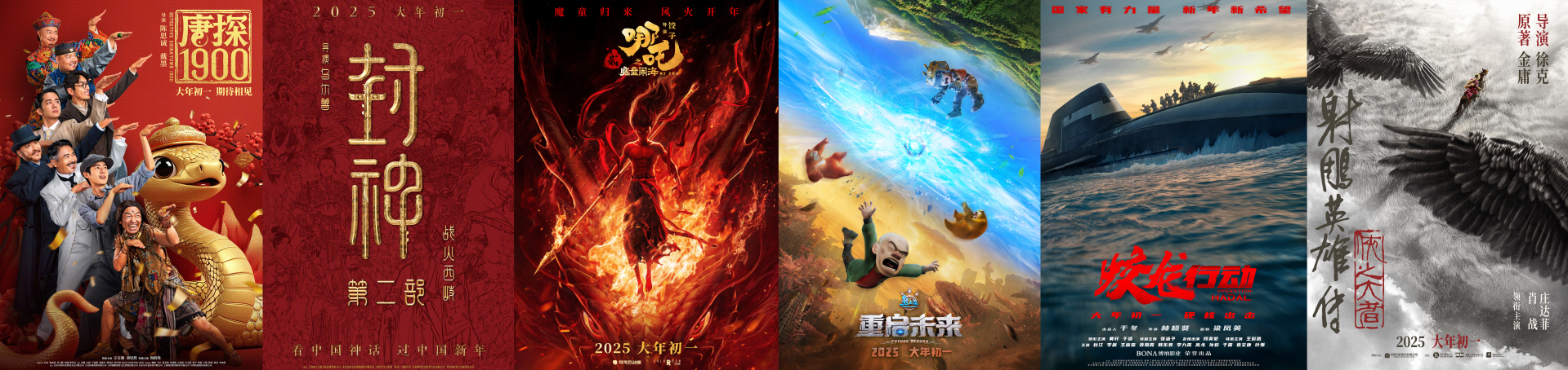 截至發稿前,2025年大年初一已開啓六強爭霸格局,國民神話史詩電影《封神第二部:戰火西岐》、中國影史動畫票房冠軍續作《哪吒之魔童鬧海》、武俠電影《射鵰英雄傳·俠之大者》、三戰春節檔的喜劇懸疑動作片《唐探1900》、軍事戰爭電影《蛟龍行動》,以及閤家歡動畫電影《熊出沒·重啓未來》等官宣春節檔上映。