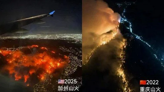 同樣,這幾天有兩張關於火災的照片也在網上廣泛流傳:一張是美國加州正在發生的山火,一張是2022年重慶發生的山火,兩者形成了強烈對比。與美國火光沖天不同的是,重慶山火發生後,當地政府幹部、消防官兵第一時間趕到一線。物資上不去的時候,無數摩托車大軍、志願者緊隨其後,毅然決然地奔赴火場。浩浩蕩蕩的車燈頭燈,組成了一道與山火對抗的“人牆長城”,也寫下了“人定勝天”的結局。