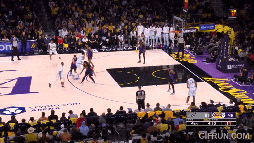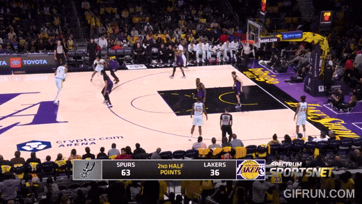 ——湖人無限換防,濃眉被調出禁區,於是馬刺點錯位、吃前板,3個扣籃兩個上籃,在湖人籃下翻江倒海。