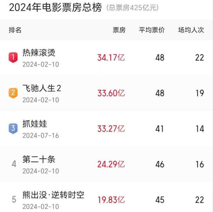 據國家電影局數據顯示,我國2024年電影總票房為425.02億元,同比減少22.7%,較疫情前恢復率近七成,觀影總人數為10.1億人次,同比減少23.1%。佔比78.68%的國產影片票房為334.39億元,較2023年下滑27.3%。票房5億+新片數量僅為2023年的一半,票房10億+新片數量則減少了13部。