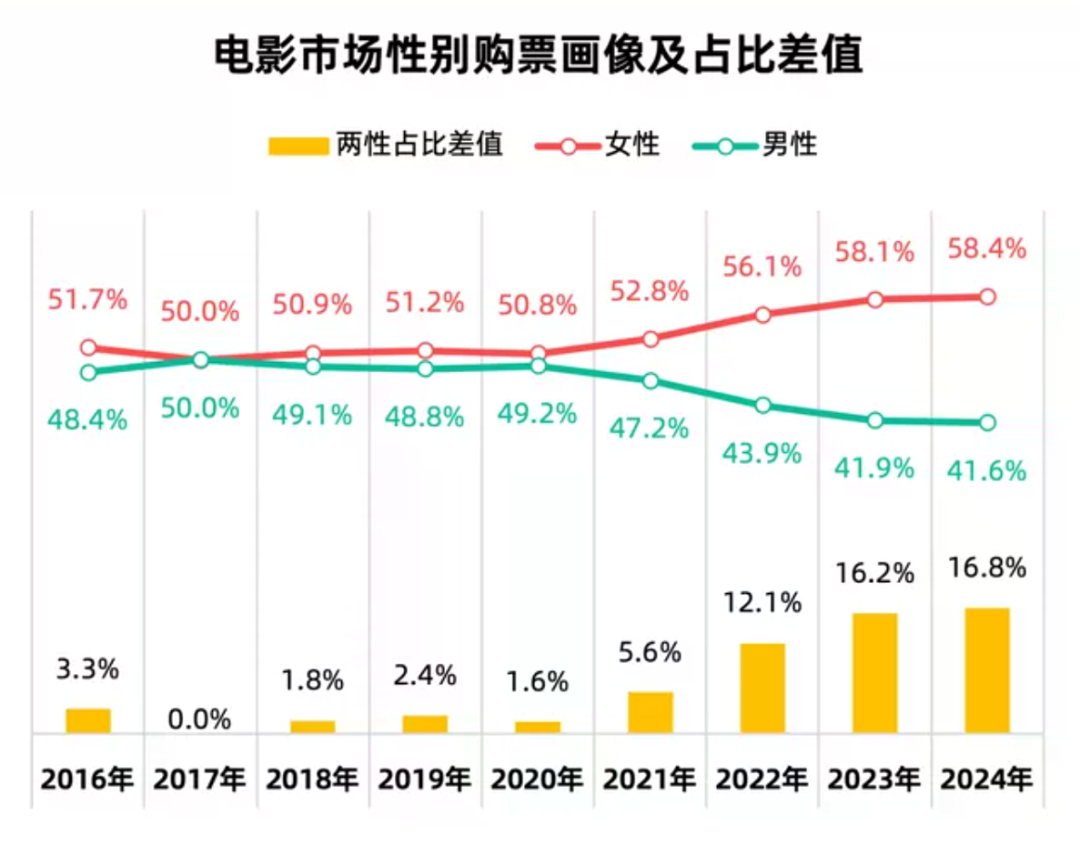 受此影響,電影市場的女性觀影羣體有持續擴大的趨勢。燈塔專業版數據顯示,2024年,女性觀眾佔比進一步提升至58.4%,在女性題材、粉絲向的電影作品中,女性觀眾佔比明顯更多。基於此,之後的電影創作大概率會出現更多偏向女性觀眾的作品,女性電影甚至有望成為下一個潛在爆點。