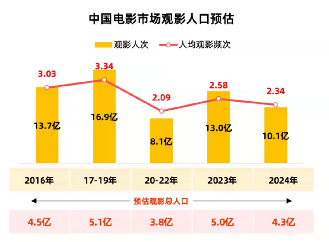 從票房數據上,這一年的表現較以往確實顯得冷清許多,尤其是2023年市場經歷了報復性增長之後,2024年票房的大面積回落成為一盆“冷水”,與之相伴,觀影人次、預估觀影總人口都在降低,給市場的感知是,人們似乎不喜歡看電影了。