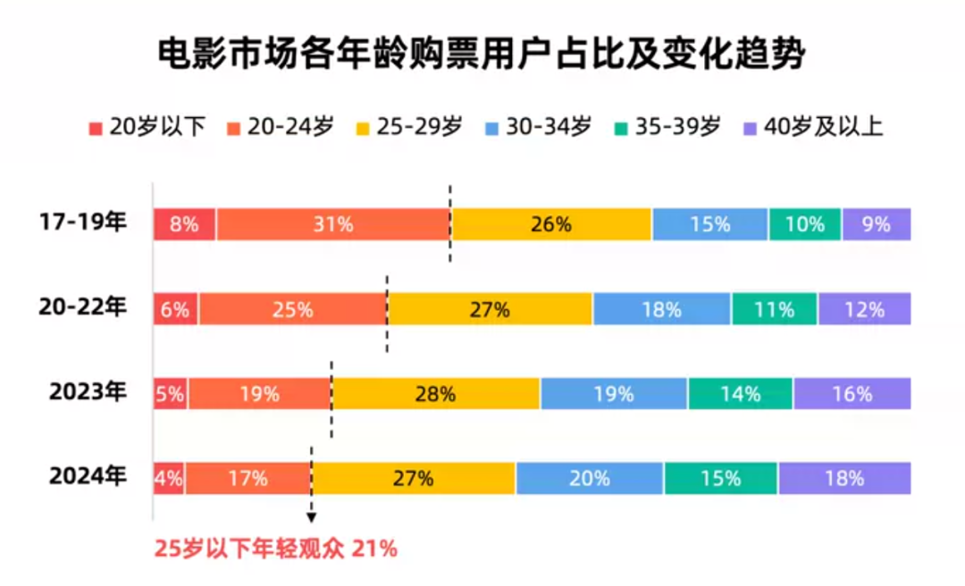 伴隨着這些變化,電影市場的消費人羣也開始發生變化,2024年,影院消費人羣年齡結構出現失衡的趨向。