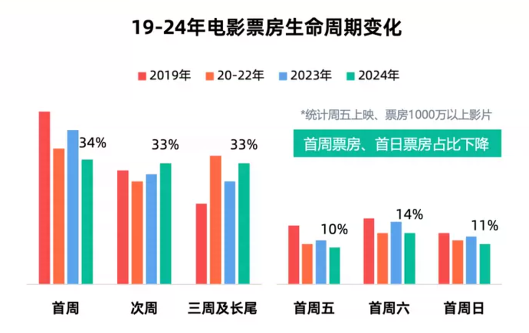 燈塔專業版數據顯示,2024年,電影首周票房佔比已經從2019年的47%下降至34%,首週五的票房甚至低於首週日。市場觀影整體後置,在一定程度上反映出市場對影片宣發的信任度降低,比起映前物料提起的觀影預期,觀眾愈發關注影片上映後的口碑表現。反過來看,影片宣發需要調整策略,覆蓋更長的票房轉化週期,驅動影片釋放正向口碑。