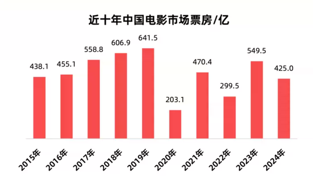 2024年是電影市場全面回落的一年,據國家電影局統計,2024年,全國電影總票房共計425.02億元,拋開疫情期間的影響,這一數據甚至低於2015年的438.1億元,“倒退十年”成為被頻繁提及的關鍵詞,高歌猛進的電影市場陷入了新的低谷期。