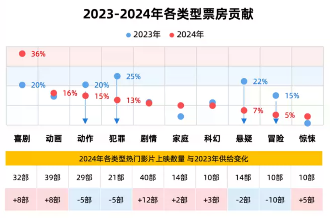 不過,雖然2024年的電影市場走向低谷,但並非沒有好消息。過去一年,喜劇電影重回高地,成為撐起電影大盤的主力題材。