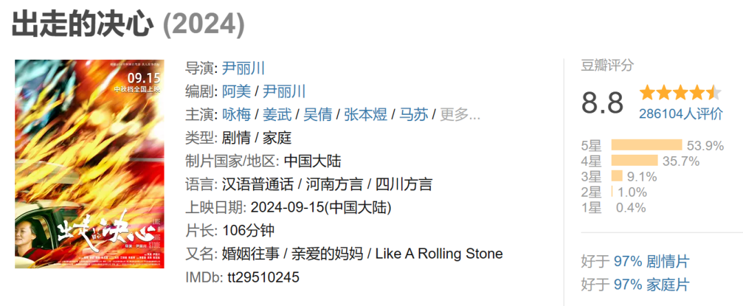 另一個亮點,2024年,女性電影頻頻帶給市場驚喜,從年初賈玲執導的《熱辣滾燙》攬下34億票房,到後來上映的《出走的決心》《好東西》分別拿下豆瓣8.8、9.1的高分,女性電影整體呈現出口碑票房雙收的趨勢。