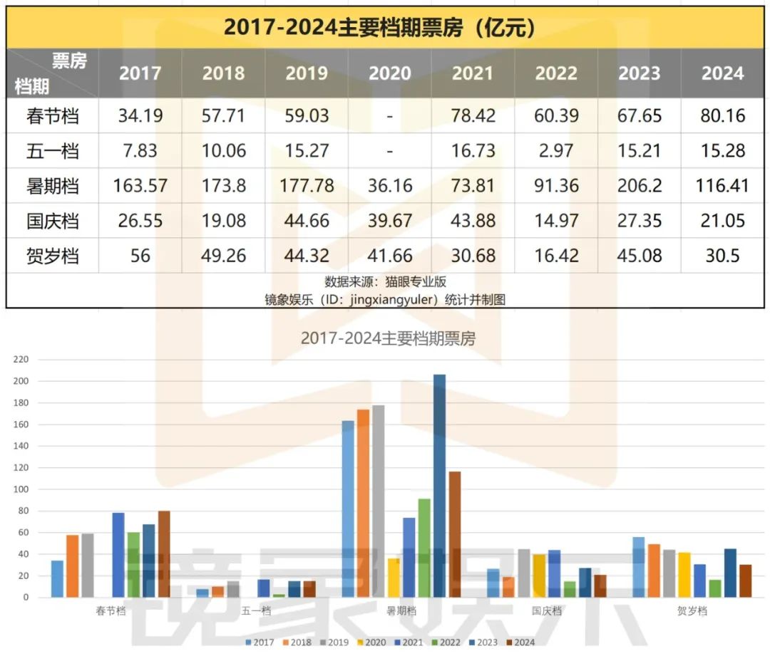2024年,大盤整體回落與熱門檔期產出降低高度相關,幾乎每個檔期都出現了票房回落的現象,尤其是票倉承載力最大的暑期檔,直接從去年的206.2億元滑落至116.41億元,近乎腰斬。