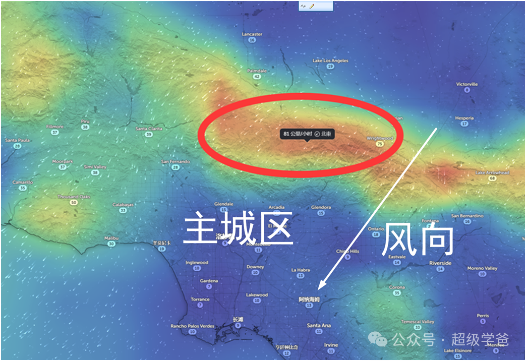 好消息是,這風是從東北往西南吹的,很快就吹到了太平洋。且這一塊已經燒過了,燒無可燒。但壞消息是,洛杉磯主城區正好位於伊頓火場的下風口。