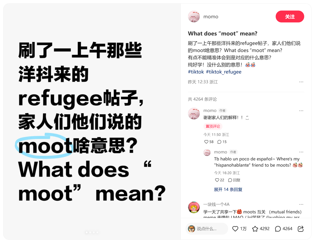 “學一天了共享一下 moots 互關 (mutual friends) meme 表情包 LMAO / lol笑鼠了 (laughing my ass off / laugh out loud ) FYP 定製化主頁 (for your page 即算法推薦給你喜歡的內容) Chinese spy/ give me your data 諷刺端掉TT時説我們偷他們數據(正向打趣) 早C晚A 指因為有時差,所以白天國內IP用户使用小紅書,晚上美國IP用户使用小紅書”