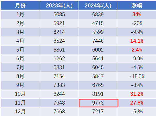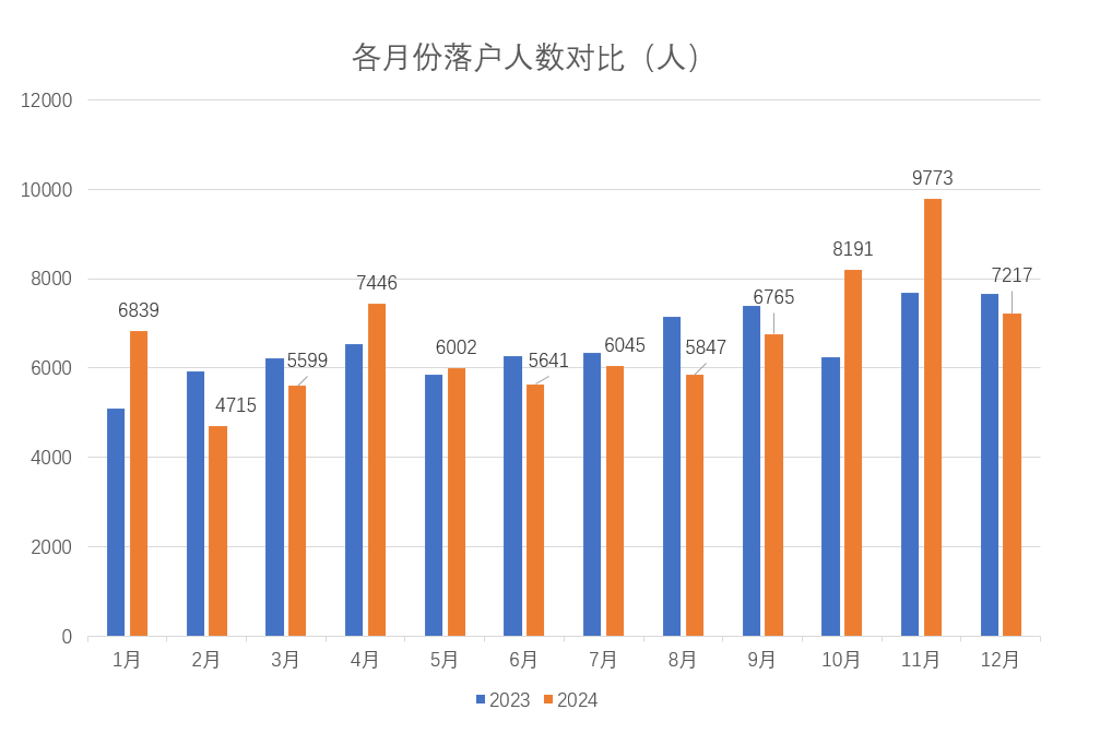 儘管2024年最多落户人數的月份是11月,比1月份增加了2934人,但是漲幅卻僅有27.8%