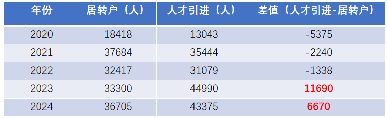 並從2023年以後,都維持一種人才引進人數遠超居轉户人數的狀態