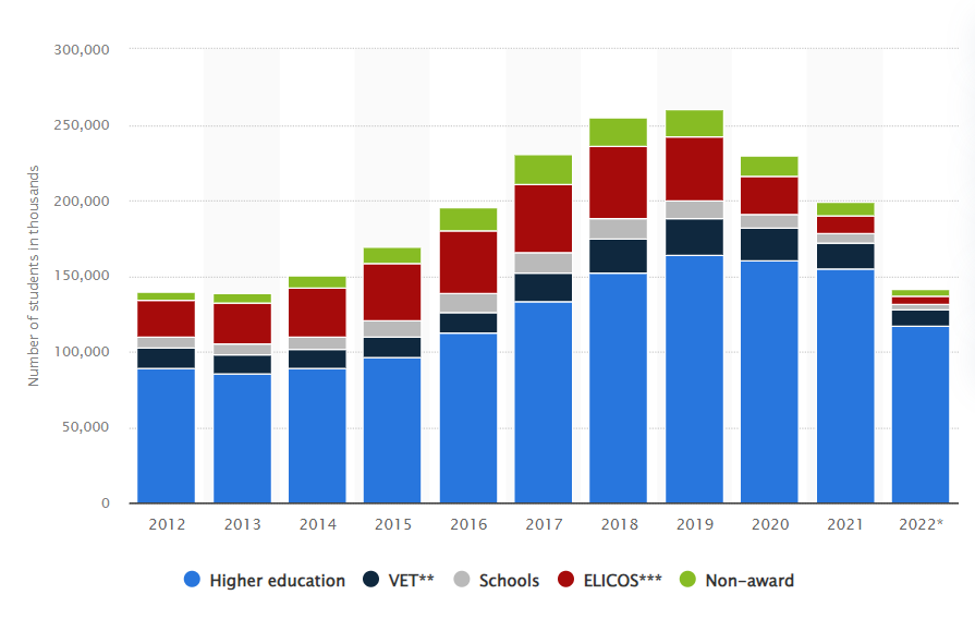 以澳洲中國留學生人數為例,可以明顯看出,在2018年、2019年達到峯值