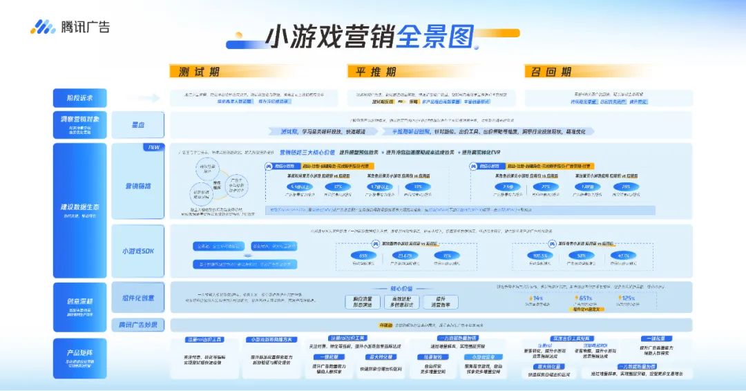 這個全景圖並非簡單的工具集合,而是一套完整的技術生態解決方案,它將小遊戲的營銷過程完整地分解為測試期、平推期和召回期三個關鍵階段,併為每個階段提供了高度匹配的技術支持和解決方案。