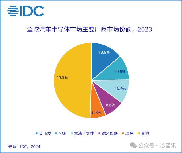 就算把範圍從車規級的芯片擴展到上游的車規半導體上,美國的德州儀器在 2023 年也只佔了全球不到十分之一。