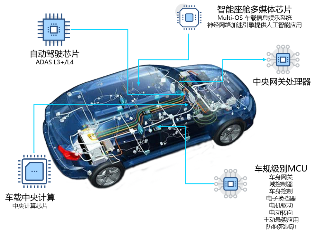 但其實呢,這倆只是所有車規級芯片裏非常小的兩個分支,因為車上幾乎所有的功能,包括看得見的和看不見的,只要想實現,就都離不開芯片的參與。