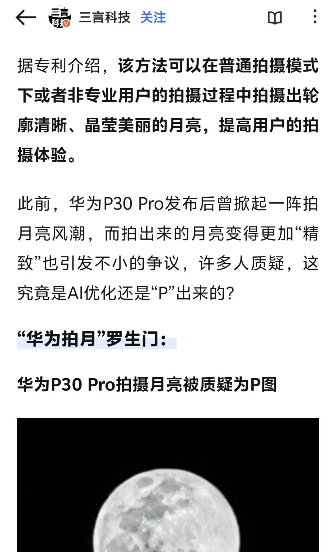 用計算攝影 “ 畫 ” 照片細節也不算是啥新鮮事兒,最早應該可以追溯到 2019 年的華為 P30 系列,當時廠商宣傳手機的長焦可以拍到非常清晰的月亮,其實是手機識別到用户在拍月亮,然後在月亮的區域植入了一張提前預製好的月相貼圖。託尼記得這在當時也引起了不小的風波。
