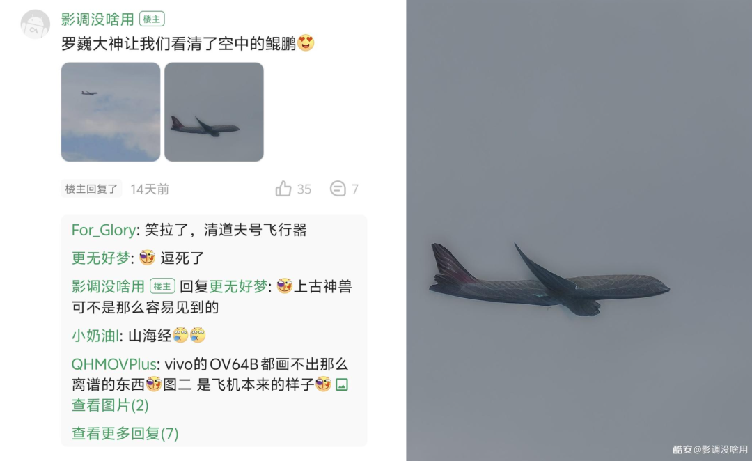 還有大神鋭評這張飛機的照片,説是讓我們看清了鯤鵬。