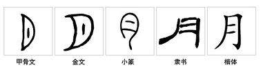 下圖是“月”字從“甲骨文——金文——小篆——隸書——楷書”的圖示發展演變過程。