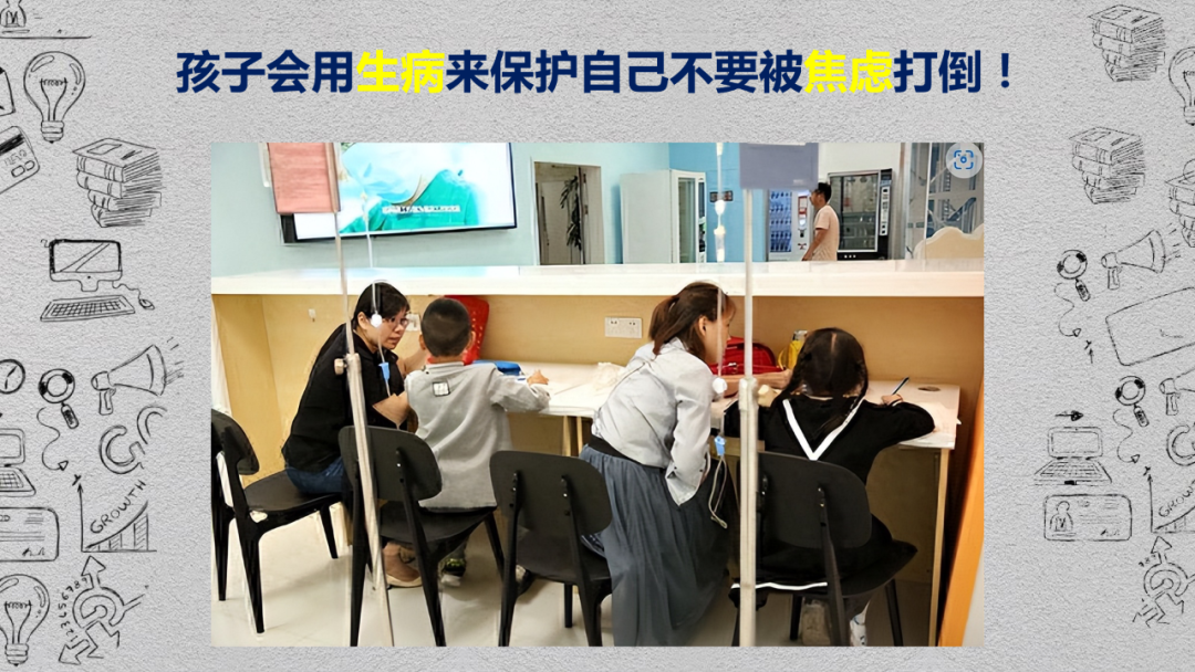 有一天他很難過,他跟媽媽説,媽媽我頭疼、我肚子疼,我不想上學,能請個假嗎,媽媽説,你不要給我裝病,你知不知道,為了你上學我付出了多少,這是全市最好的學校,這孩子就去上學了。很快這個孩子就出現了,非常難以控制的抽動現象,後來在學校裏頭被嘲笑、被模仿,學校就建議他要去看病,直到這個時候,媽媽才發現孩子生病了。