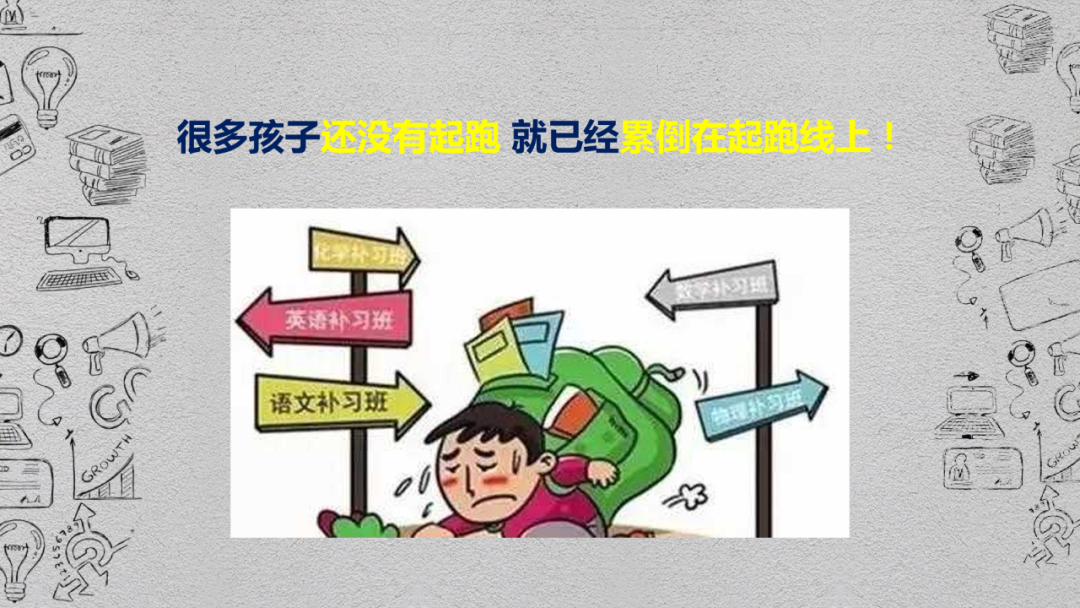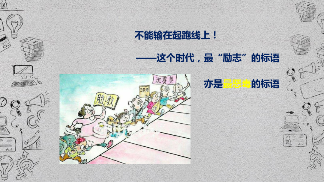 連我們的胎兒都要開始參與賽跑,他必須要在媽媽的肚子裏聽莫扎特的音樂,他還要跟沒有見面的媽媽一起做有氧運動,甚至還要隔着羊水聽媽媽念英文單詞。當他出生了以後,他就更累了,所以好多孩子還沒有跑,就已經累死在或者叫累倒在起跑線上了。