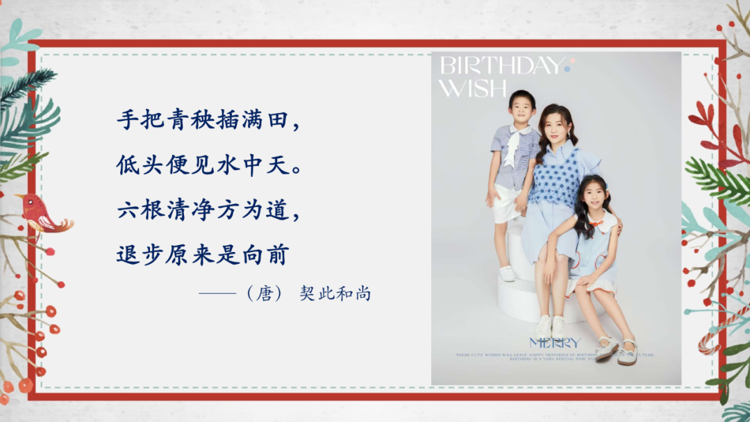 想起了這首詩,叫手把青秧插滿田,低頭便見水中天,六根清淨方為道,原來退步是向前,這是我年輕的時候的照片,看上去母慈子孝對不對,但其實也曾經一地雞毛。所以,我相信每一個家庭都會有這樣的經歷,但是沒有關係,當我發現我能靜下來,我能慢下來的時候,我的温柔便變成了最強大的力量,我的等待也變成了最大的動力。