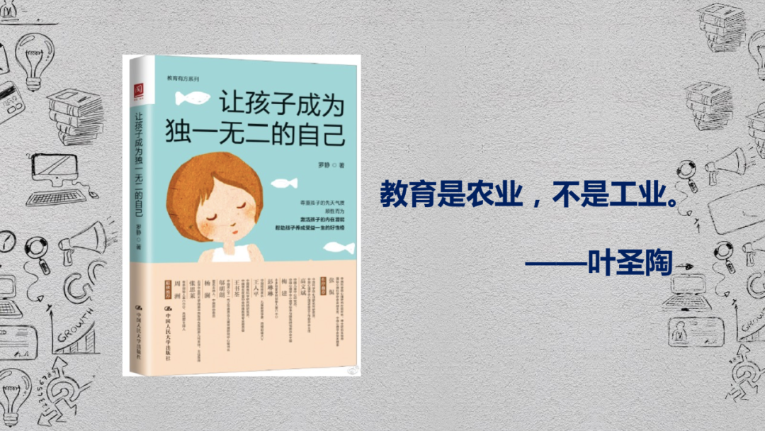 我特別喜歡葉聖陶先生説的一句話,叫做教育是農業,不是工業。這句話告訴我們,每朵花都有它的顏色,都有它的形狀,都有它的花期,都有它不一樣的地方,哪怕它很小,它也會招來喜歡的目光。所以我們要慢慢養我們的孩子,你知道慢養,才會能夠讓孩子真正的找到自己,所以慢工出細活兒,功到自然成,養育孩子,在我看來慢就是快。