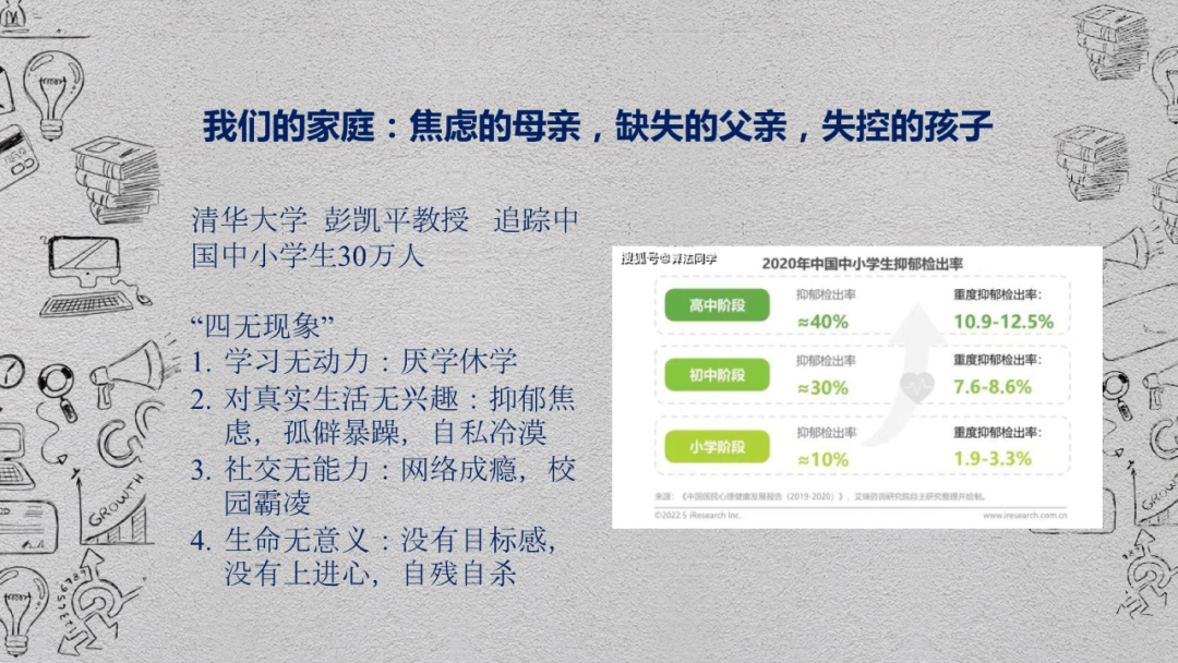 《中國國民心理健康調查藍皮書》中,發現孩子活得好不快樂,小學生10%多的抑鬱情況,高中生已經達到了40%的抑鬱情況,我們的孩子一點兒都不幸福,我想説我們的孩子出問題了,我們花了二十年的時間,成功的把孩子變成了病人,所以 接下來我們該怎麼辦。