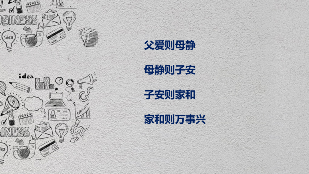 我們中國有一句老話叫 家和萬事興,可是你知道萬事興的前提是子安,孩子安寧,子安的前提是母靜,如果我們的母親不躁動 不焦慮 不煩躁,我們的孩子必然會安定安寧,而母靜的前提是父愛,一個家一個孩子的成長 它是一個系統,它需要每一個家庭成員付出更多的努力。