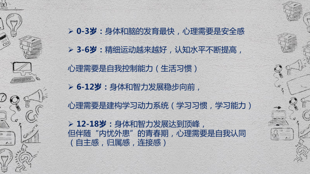 接下來,來到了小學,我們拿着小鞭子在後面趕他6~12歲身體和智力,開始穩步發展的時候,我們最重要看見的就是學習的成績,這個階段其實我們要幫孩子,培養的是動力系統,我們在6~12歲,可能要通過幫助孩子,養成一些學習的習慣,幫助他們培養一些學習的能力,從而讓他們堅信,他們可以有更美好的學習的未來。